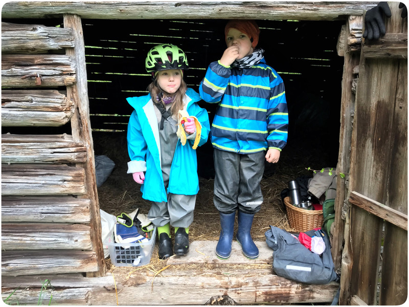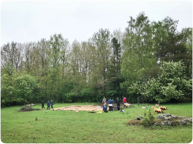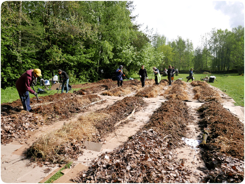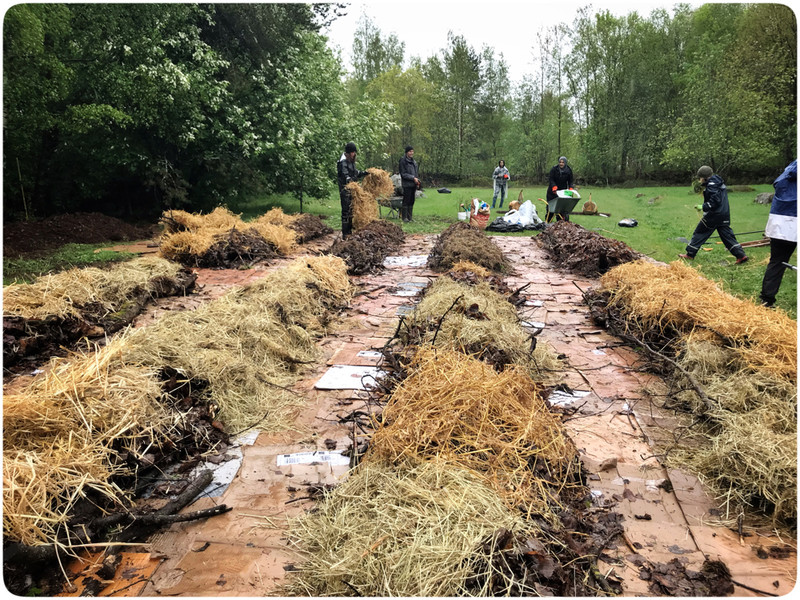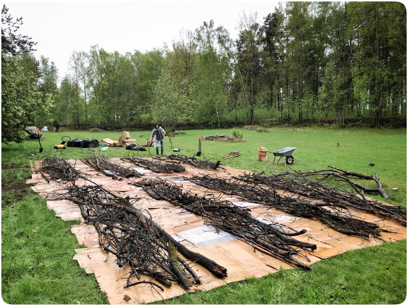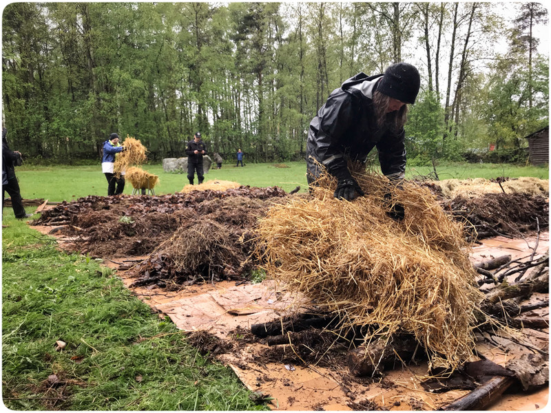 På lördag började vi med att samla ihop kvistar, grenar och grovt material att bottna våra odlingslimpor med. Vi har räfsat hela hästhagen och girigt samlat ihop alla löv vi har kunnat hitta. Regnet föll men var inte alls till besvär utan snarare tvärtom. Det var rent av skönt att ha något som svalkade, och picnic i en lada är inte illa alls.