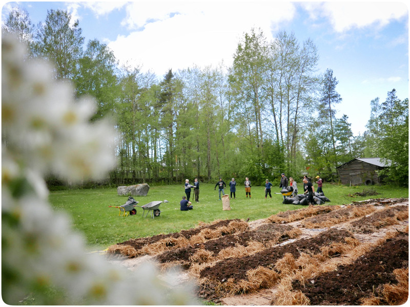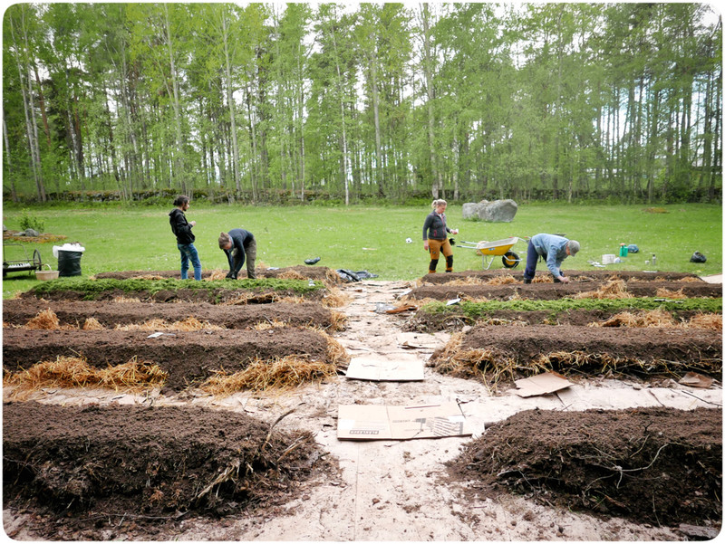 De två senaste dagarna har varit lite extra roliga när vi byggt upp tillsammansodlingen här i centrum av Nykarleby. Natten till lördag drömde jag stressdrömmar om att det var så hett att ingen av deltagarna dök upp, men så blev det inte. Både den regniga lördagen och idag när solen stundom värmt ordentligt har det varit full rulle i odlingen.